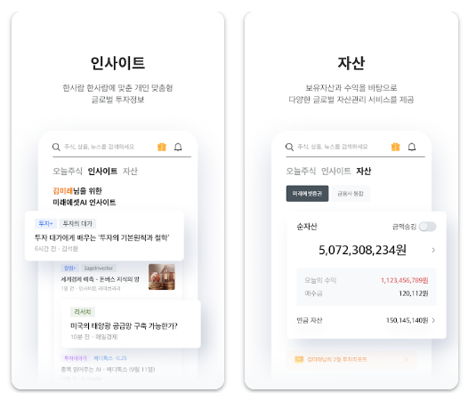 넷째, 자산 관리 기능입니다. 보유 자산, 수익률, 투자 현황 등을 한눈에 확인할 수 있으며 포트폴리오 관리도 효율적으로 할 수 있습니다.