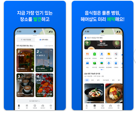 앱 설치 후 첫 실행 화면에서는 통합 검색창, 지도 화면, 탭 메뉴 등이 표시되며 각 기능으로 빠르게 이동할 수 있는 구조로 되어 있어 초보자도 어렵지 않게 사용할 수 있습니다.